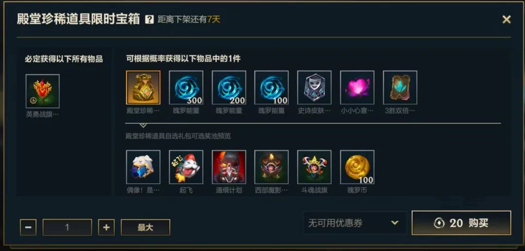 即日起至12月31日,衆多稀有個性化道具限時返場!召喚師可使用20點券購買殿堂珍稀道具限時寶箱,開啓100次至少獲得1個殿堂珍稀道具自選禮包,禮包內包含動態局內表情-起飛動態頭像-通緝計劃動態局內表情-偶像!是偶像!等個性化道具~