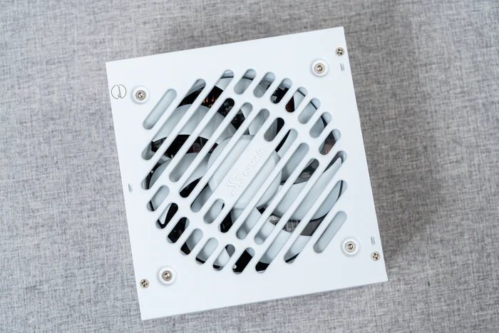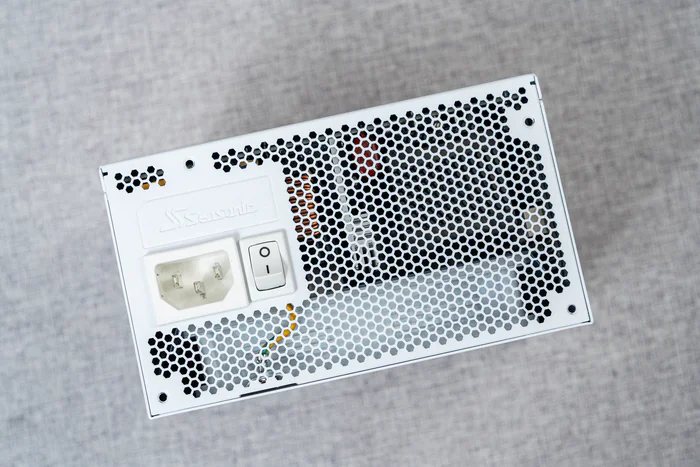 尾部出风口特写,依然有SEASONIC海韵logo,电源口和电源开关也是纯白的,不过这里未设计风扇停转模式开关HYBRID MOD