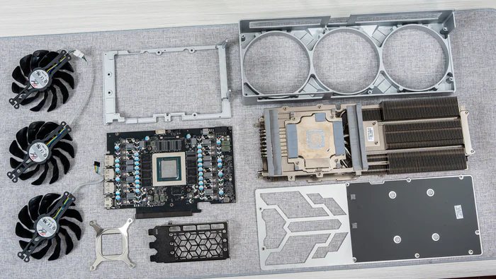 取出GeForce RTX 4070Ti SUPER 金属大师Plus OC显卡的本体,非常的大块头,而在铝坨坨的压铸铝散热加持下显得异常金属风格