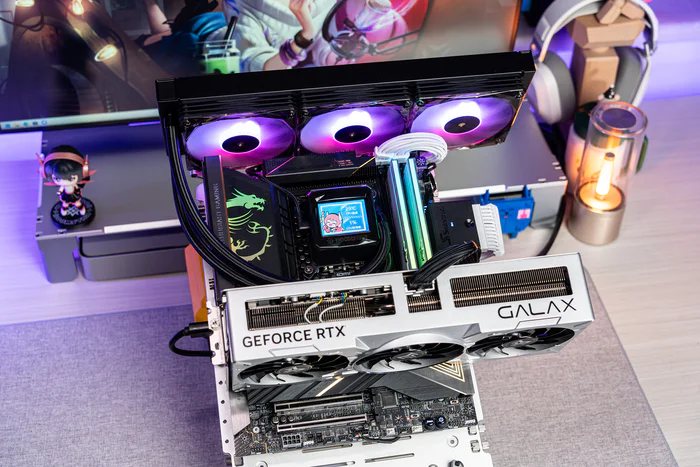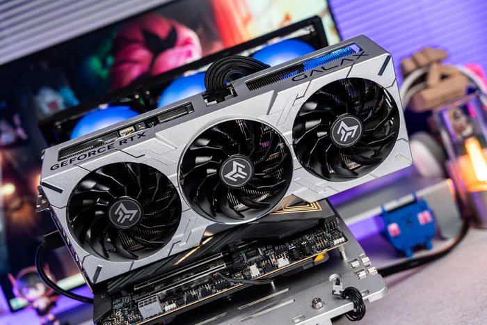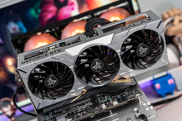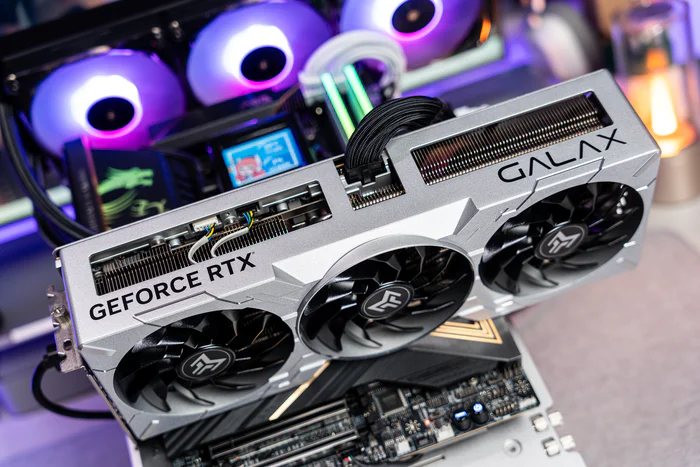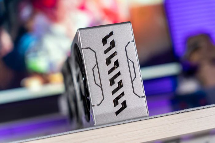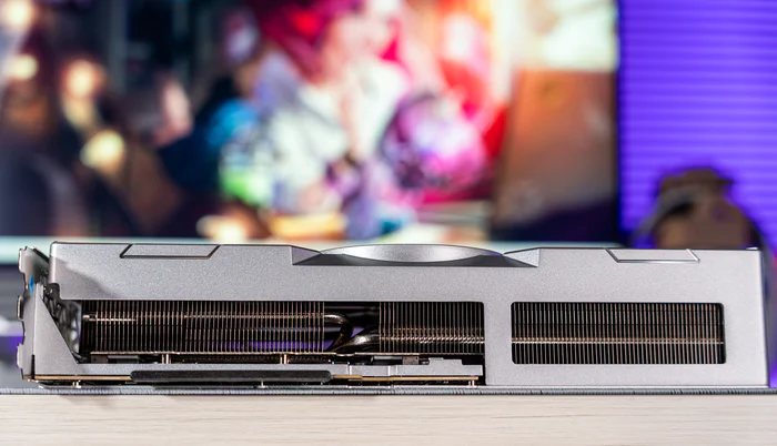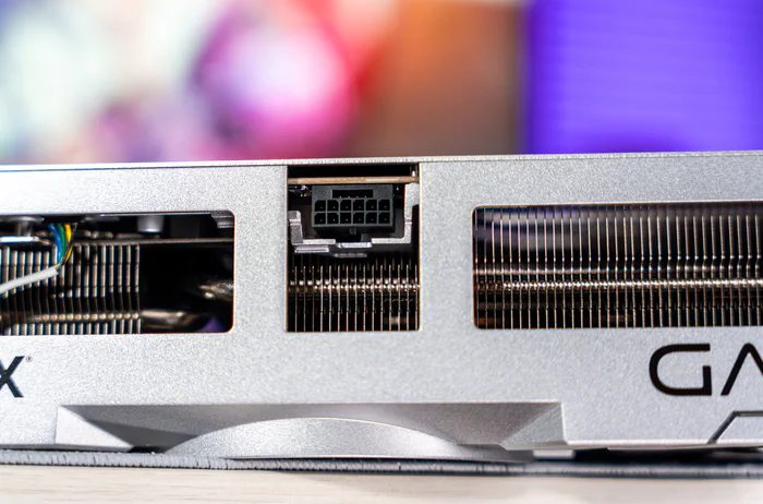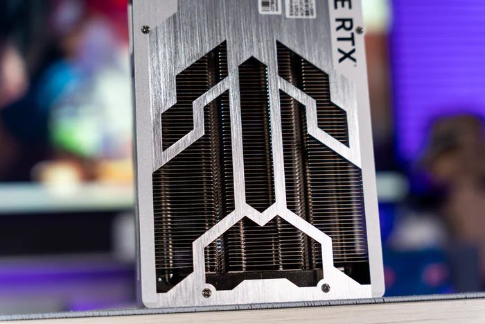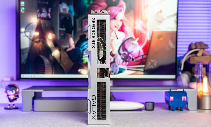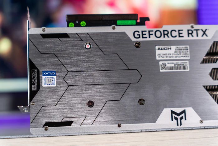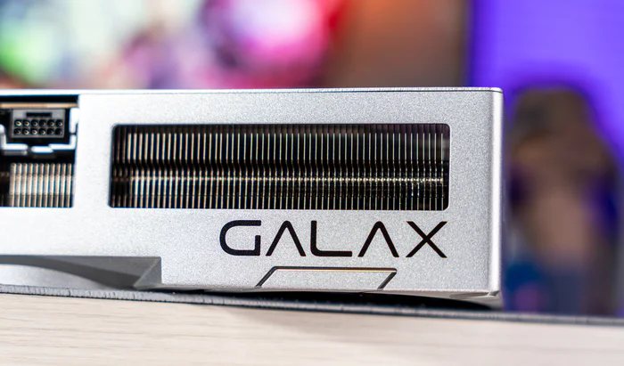 顶部的影驰logo“GALAX”,中框内部整整齐齐排列的超宽散热鳍片