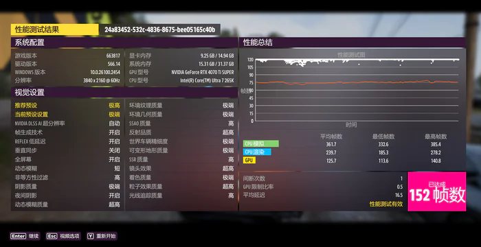 地平线5在4K分辨率的极端特效下开启DLSS与帧生成下测试平均152FPS