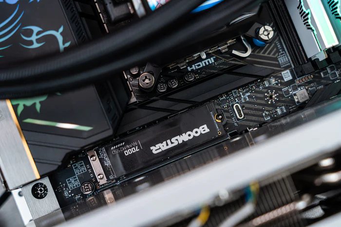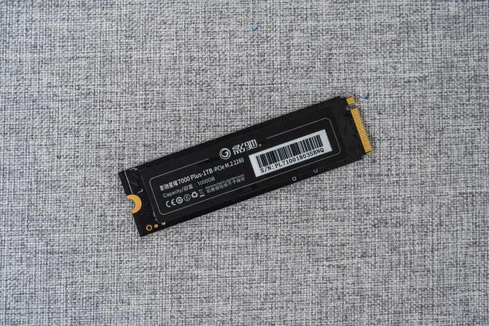 固态硬盘是来自影驰的主流PCIe 4.0 SSD:星曜7000 Plus SSD。它的产品标称顺序读写速度就分别达到了7000MB/s、6000MB/s,就如同它的名字一样。其主控为群联PS5027-E27T,并且采用的TLC颗粒