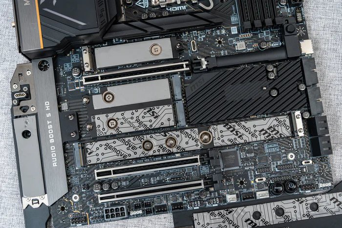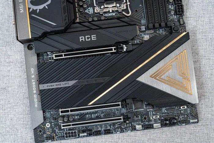 打开两片冰霜铠甲,即可看到Z890 ACE主板共提供了5条M.2,其中第一条为PCIE5.0 X4,其余为PCIE4.0X4。而通过主板上面的标识可以看到1和2都由CPU直出,4为芯片组/CPU可切换模式,3和5由芯片组直出;另外,芯片组上方还设计有显卡快拆,按下即可锁止或解锁PCle插槽卡扣,可大大简化显卡拆装流程,而右侧按钮上的小窗口有锁定/解锁的白色标识,使用上非常方便