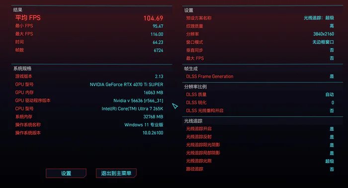 2077在4K分辨率光线追踪·超级的特效下开启帧生成的DLSS3以及DLSS的情况下的测试平均104.69FPS