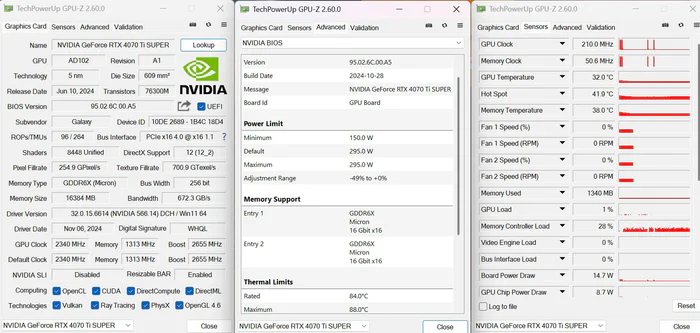 GPU-Z显示的GeForce RTX 4070TI SUPER 金属大师PLUS OC的显卡信息以及295W的TGP功耗等,另外待机温度相当低哪怕是在风扇停转情况下,还有待机功耗也仅15W左右