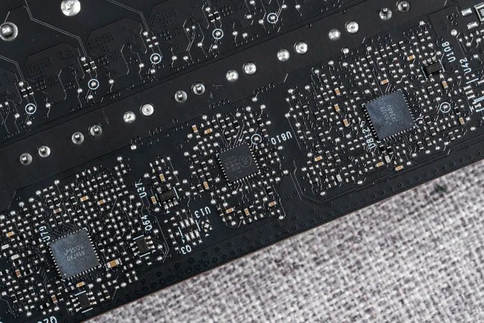 次顶级主板背面使用了纯金属的背板,配色金色线条和 ACE标识,非常有质感同时又具保护功能,2盎司铜8层服务器级别的PCB