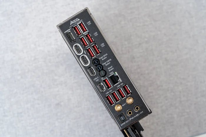 背板接口相当丰富,MEG Z890 ACE的背板接口相当于满配,已经布满了整块背板,后面拆解中也可以看到背板接口有一张6层PCB的扩展接口才能达到如此的规模。具体的配置方面,从上至下依次为集显HDMI、2个40Gbps的雷电四接口(相当于每秒传输约5GB的数据可满足传输大量数据的需求),10个USB 10G!,2个USB-C 10G,总计14个USB666,3个按钮FLASH BIOS Button、Clear CMOS Button、Smart Button,10 GB有线网口、WI-FI 7无线以及镀金的音频接口