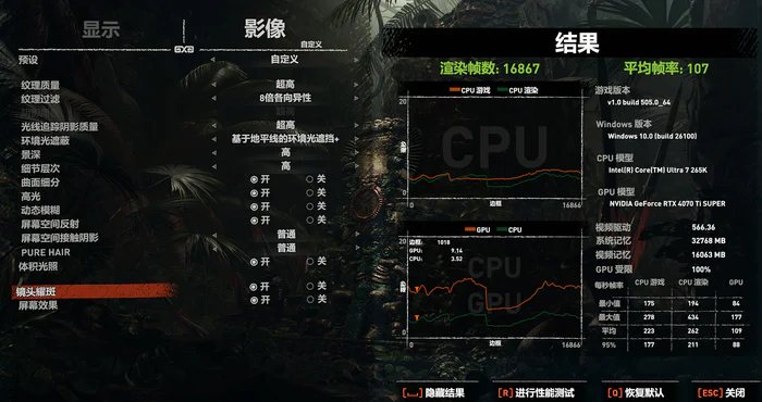 古墓丽影·暗影在4K分辨率开启超高光线追踪和DLSS的特效下测试平均107FPS