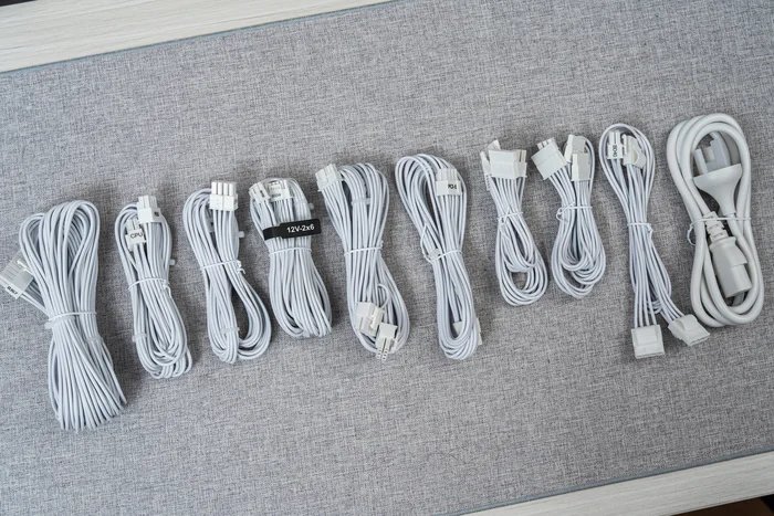 全套全模组的压纹线,这次的模组线与电源线也都升级成全白色,包括线缆、接口都是纯白,且线缆的+12V采用16AWG线径和H++等级的耐高电流合金铜端子,具有低温升和强导电性,确保输出更加稳定可靠