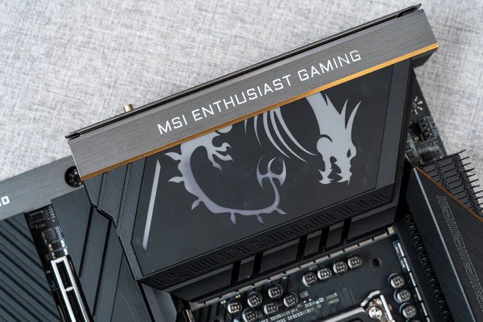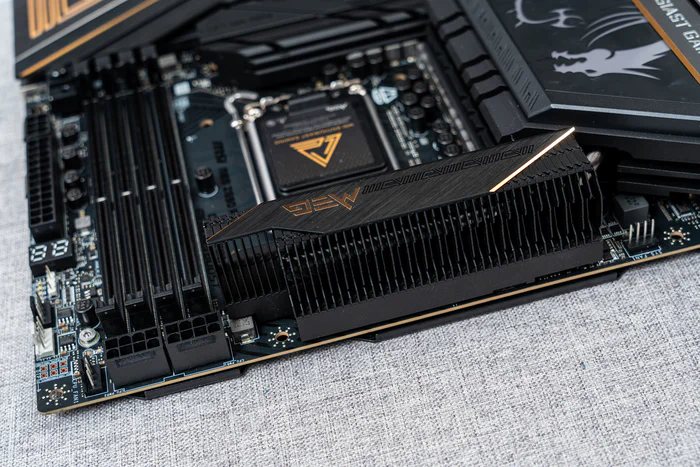 扩展型VRM散热片,一排银色的字体“MSI ENTHUSIAST GAMING ”代表着这是微星顶级的MEG系列,中间是带ARGB的微星龙图腾,整个散热模组下面使用了导热热管+高效能导热贴+电感导热垫片的豪华用料