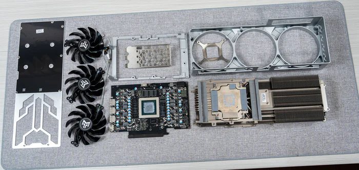 拆卸背板螺丝、拧开核心弹簧螺丝、取下背板、拧下挡板螺丝和挡板之后分离散热器,将散热器的内部6颗固定螺丝拆除取下金属外壳,再拧下风扇螺丝取出风扇,最后分体PCB与金属中框,完成拆解