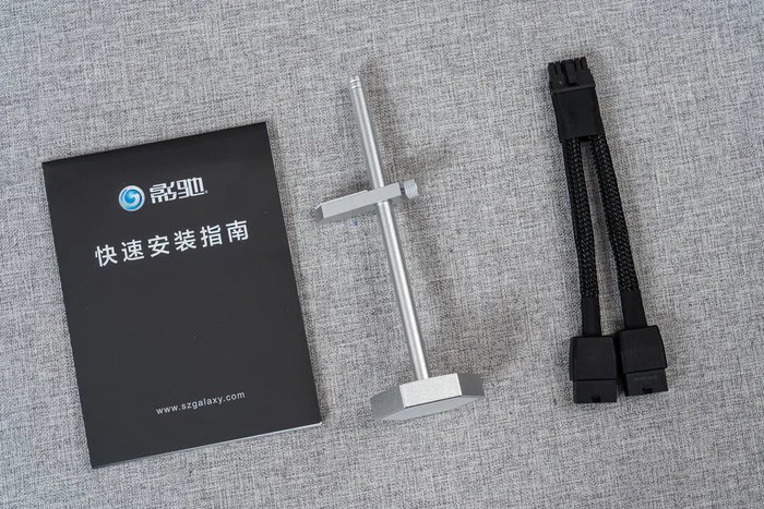 配件简单,提供了快速安装指南,一个全铝合金的显卡支架和1条12VHPWR转2*8Pin供电线缆