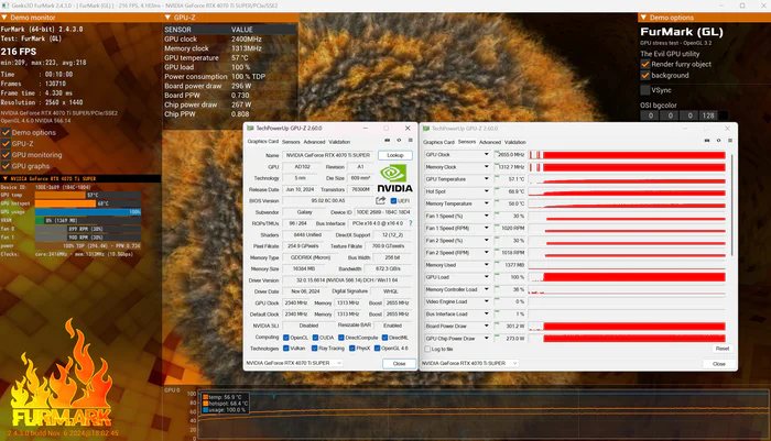 新版甜甜圈烤机10分钟之后,显卡的温度为核心57.1°、热点68.9°、显存58°、功耗300W,风扇转速30%的1000转,这个转速下的烤机功耗300W并只有这么点点温度,确实可以说4090级别的散热器功不可没