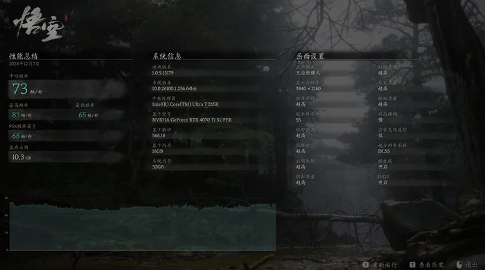 黑神话·悟空在4K分辨率下,开启55%DLSS与帧生成、超高画质等级与低级全景光线追踪下测试平均73FPS