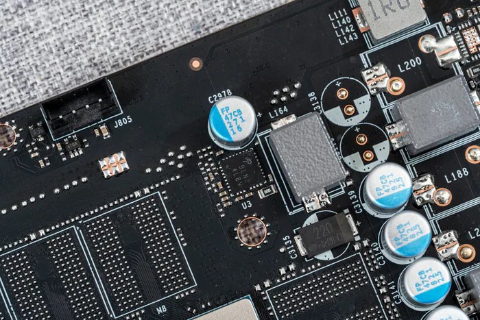 PCB背面这里GPU供电主控uPI uP9512U、显存供电主控为uPI uP9512R、中间的ON 45491为安森美的供电管理芯片