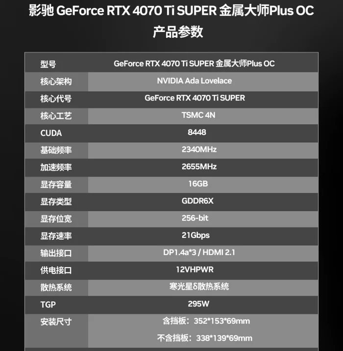 首先是这款影驰GeForce RTX 4070Ti SUPER 金属大师Plus OC显卡的产品参数,除了4070Ti SUPER的特性外,该款显卡基础频率2340MHz,加速频率2655MHz,TGP功耗295W,尺寸含挡板为352*153*69mm,不含挡板为338*139*69mm。