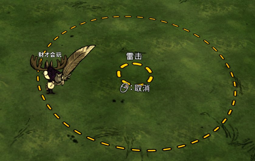 左側下面的第一個技能是羽喚閃電,羽毛扇可以使用約束靜電將其升級,升級後的羽毛扇,鼠標右鍵可以召喚閃電,冷卻時間大約2分鐘(閃電會劈自己)。
