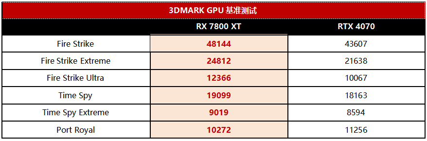 ▲RX 7800 XT的3DMark GPU光栅测试项目得分是高于RTX 4070的