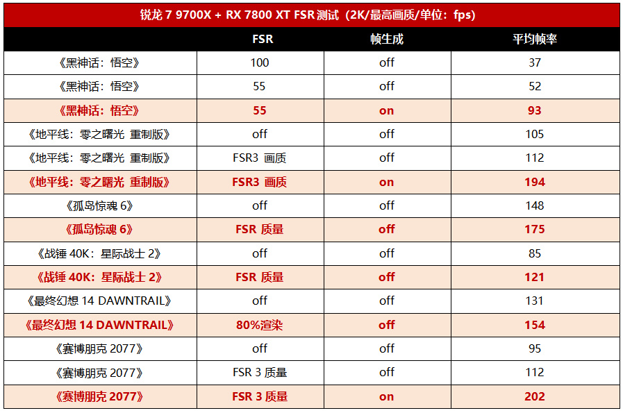 我们知道,AMD FSR技术还能进一步提升游戏帧率,如果与RX 7800 XT搭配的话效果又如何呢?从测试可以看到,在《黑神话:悟空》中,将FSR设置为55,开启帧生成的话,相比FSR 100无帧生成可以提升151%的帧率;《地平线:零之曙光 重制版》《赛博朋克2077》原生支持FSR 3,开启FSR3画质模式和帧生成之后,帧率可以暴增85%和113%;此外《孤岛惊魂6》《战锤40K:星际战士2》开启FSR质量模式后,帧率分别提升了18%和42%;《最终幻想14 DAWNTRAIL》开启FSR 80%渲染后,帧率提升了18%。由此可见,对于RX 7800 XT + 锐龙7 9700X用户来讲,强烈推荐在游戏中开启FSR功能,从而获得更高的帧率。当然,最好再在显卡驱动面板中开启Radeon Anti-Lag低延迟功能,获得更迅速和平滑的操作体验。