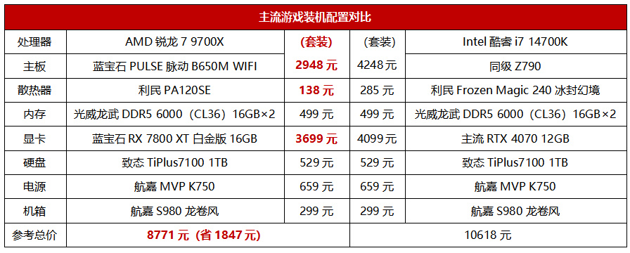 从前面的测试可以看到,拥有16GB超大显存的RX 7800 XT确实不愧为2K极限画质体验游戏大作的强力装备,游戏实战帧率都非常高,综合游戏性能强于RTX 4070,而且在FSR技术的加持下还能进一步提升游戏流畅度,和锐龙7 9700X搭配可以组建一套性价比非常高的2K游戏主机。同时,锐龙AM5平台还拥有更大的升级空间,未来可以无缝升级Zen6,不用换主板内存,有效保护了用户的投资。从我们列出的两套配置可以看到,得益于更高的性价比,RX 7800 XT + 锐龙7 9700X这套主机不但游戏性能更好,总价相对酷睿i7 14700K + RTX 4070主机还有1847元的优势,性价比可以说是遥遥领先,确实是2K游戏玩家一步到位的上佳之选。