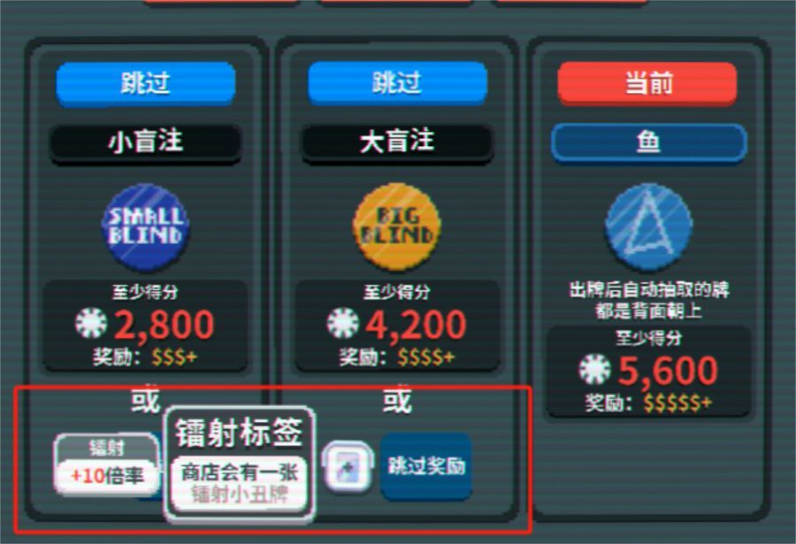 游戏的盲注跳过是一大特点,如果玩家选择跳过盲注,将会失去战斗奖励和一次商店交易成长的机会,这一点其实本质上也是运用了赌徒心理,跳过盲注可能会获得一些增益效果,但是增益效果往往是不明确的,例如下图中的镭射效果,因为你不知道附有镭射效果的卡牌是否会是你想要的牌,在你的小丑牌组合不够顺利的时候,错失金币和一次成长的机会往往可能会让自己陷入困境。前中期如果连续跳过奖励运气不好往往意味着重开,但对于rogue来说,重开是再正常不过的事情,更何况对于这种快节奏的卡牌。