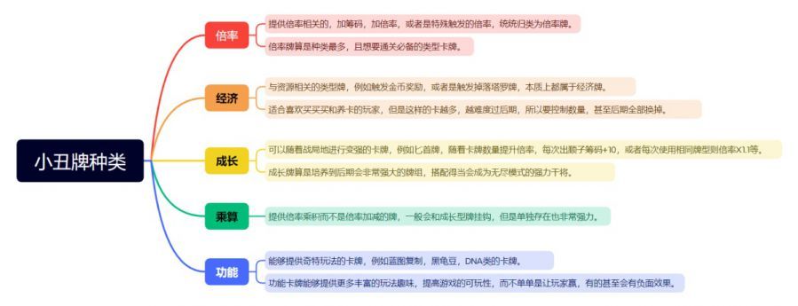 游戏的局内局外build主要就是围绕着小丑牌来,小丑牌的解锁方式也各式各样,相当于游戏设计师把部分成就直接和小丑牌绑定了,解锁之后就会出现在商店中。小丑牌的类型我做了分类,可以归类为5个类型,不同的类型搭配从而有不同的打法。