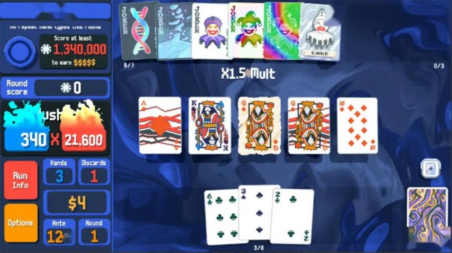 《Balatro》算是一款融合roguelike的卡牌构建游戏,与传统卡牌游戏不同的是,这款游戏本身是没有战斗的,你只需要在系统给你卡中根据规则打出组合(类似斗地主的顺子,连对,三带二之类),不同组合有不同的分数,累计分数超过关卡目标即可。是不是很简单?