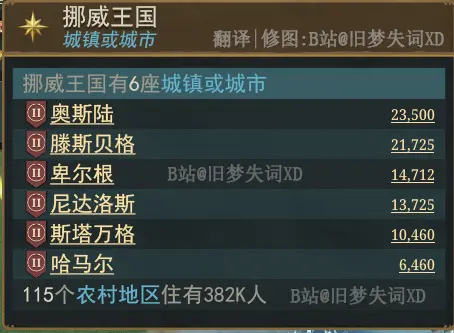 圖片展示了挪威的6個城鎮,這些人口包括該地塊的整個農村地區,也就包括了所有農民。遊戲開局的奧斯陸總共有900名市民。這將給玩家帶來一定的挑戰,因爲這些人口數既不大,也不夠集中。