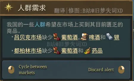 另一個方法便是查看提示,我發現國內部分人羣的需求沒能得到滿足。雖然我可能不會太在意奧克尼的居民是否能從都柏林市場獲得他們所需的商品,但我們至少可以考慮滿足呂貝克市場的需求。
