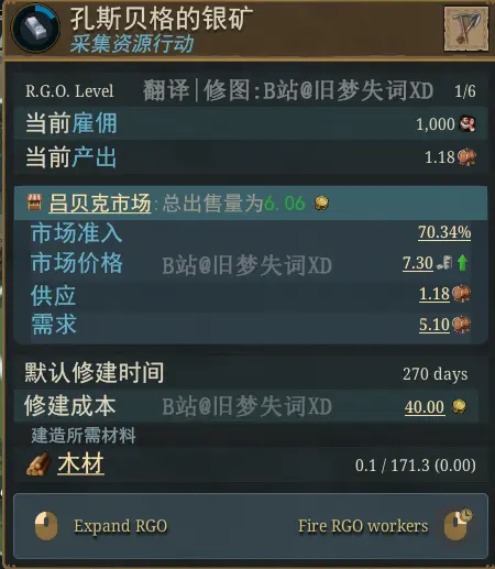 目前這只是一座一級礦,隨着該地的發展,我們可以提升到六級礦,一共能僱傭6000名農民。目前市場上銀是供不應求的,但只要升滿級,就能夠產出滿足需求的產量。這是挪威經濟不可或缺的一部分,我們目前能夠從這個地塊徵收5%的稅收。
