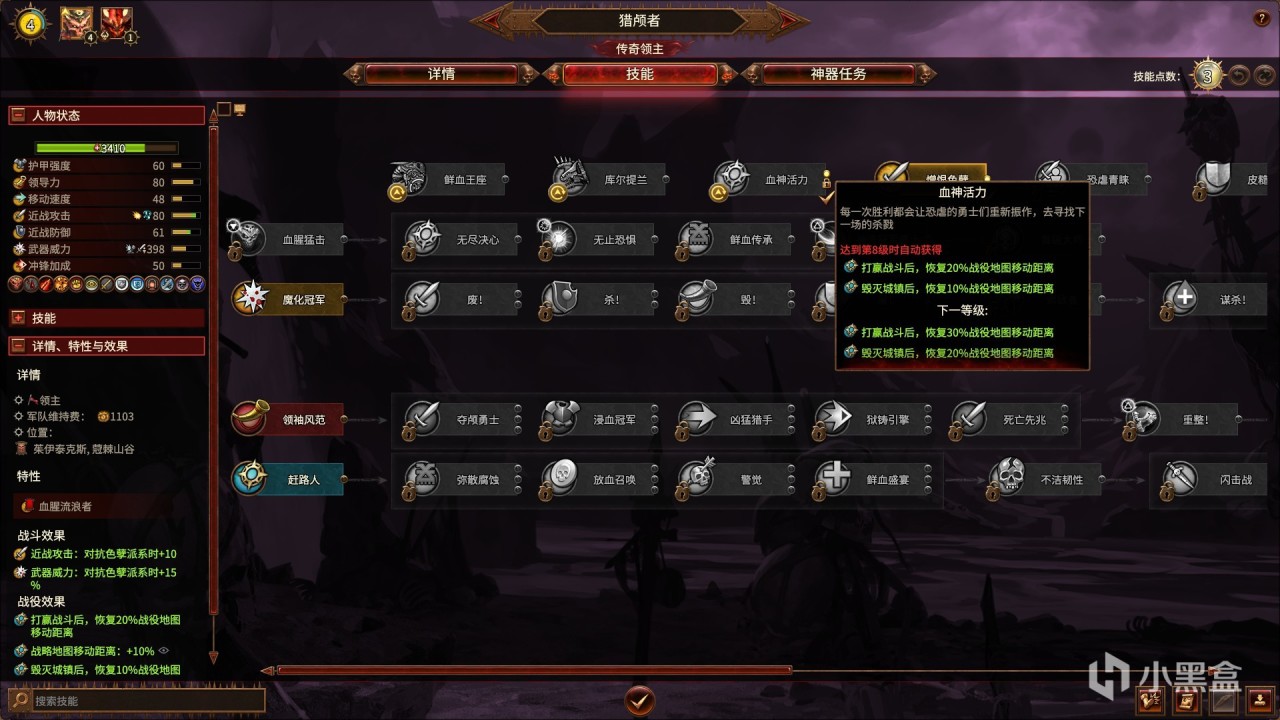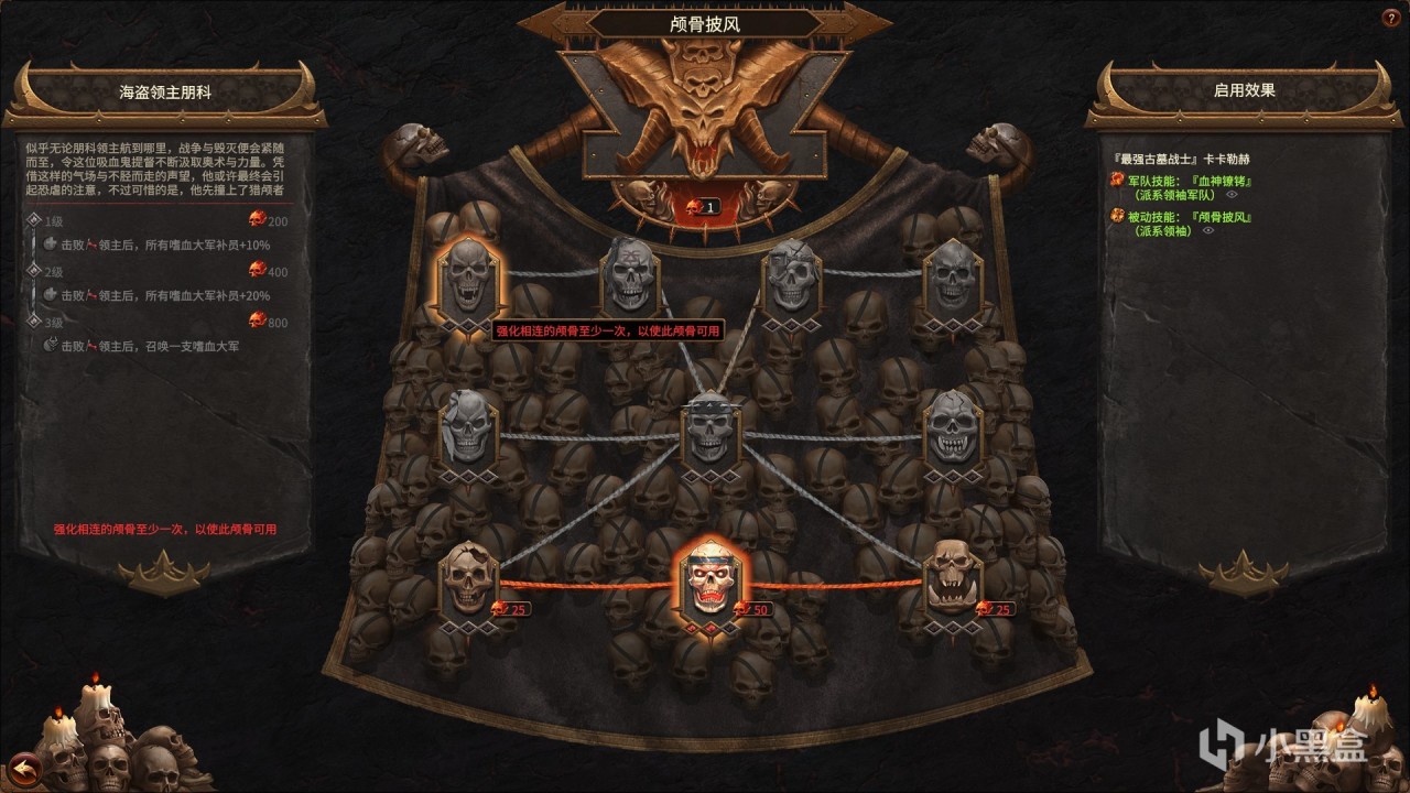核心机制:颅骨披风。用勇士精粹解锁强化十个颅骨,获得强力技能。比如其中一个颅骨技能点满后,猎颅者可以获得50%被击败领主的经验,其他领主可以获得5%的经验,这个比例还是很恐怖的。最顶上的有一个颅骨的技能点满后,技能效果是“击败领主后,召唤一只嗜血大军”,战胜嗜血大军补员+堆叠召唤,这个强度可想而知,简单粗暴又强力!