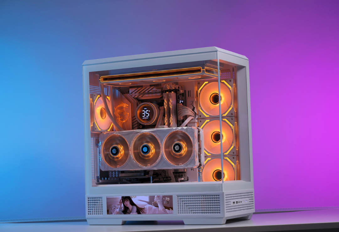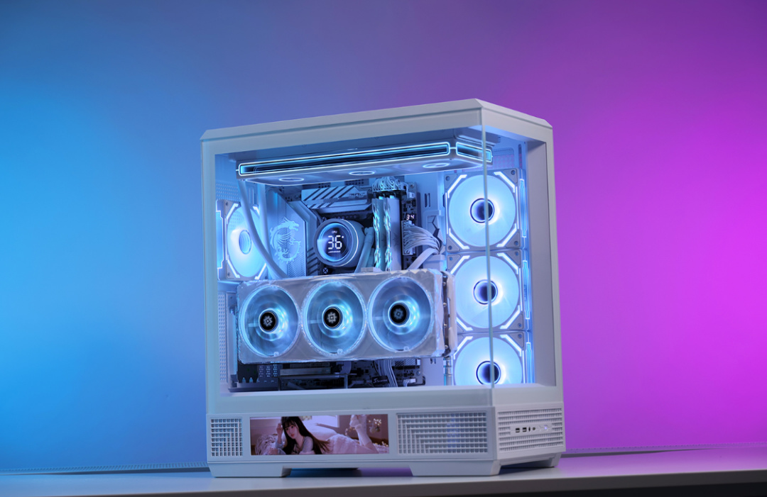 明确了全白的主题以及具体的配置,机箱的选择就显得尤为重要。海景房过于普通,那给海景房配上一块高清大屏,自然就是另一个结果。今儿的主角,爱国者星璨大岚白色屏显版机箱,除了熟悉的无A柱设计和270°的可视角度,最吸睛的当然还得是电源仓侧边这块9.16英寸大小的高清显示屏(分辨率为1920*462,可显示硬件信息也可以自定义上传图片或MP4视频)。
