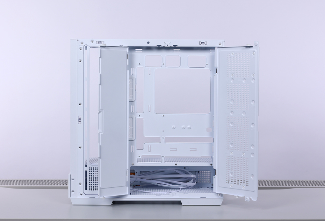 机箱背部理线空间充沛,同时还有大量扎带固定孔位以及翻门式挡线板,可以让玩家背线无忧。侧开门式的硬盘支架最多可同时安装2*3.5寸和2*2.5寸SATA硬盘,极大的提高了机箱背部空间你用效率,也降低了电源仓空间压力。最大可支持安装的电源长度在提升到了270mm,还能让电源仓中再加装1块3.5寸HDD硬盘。