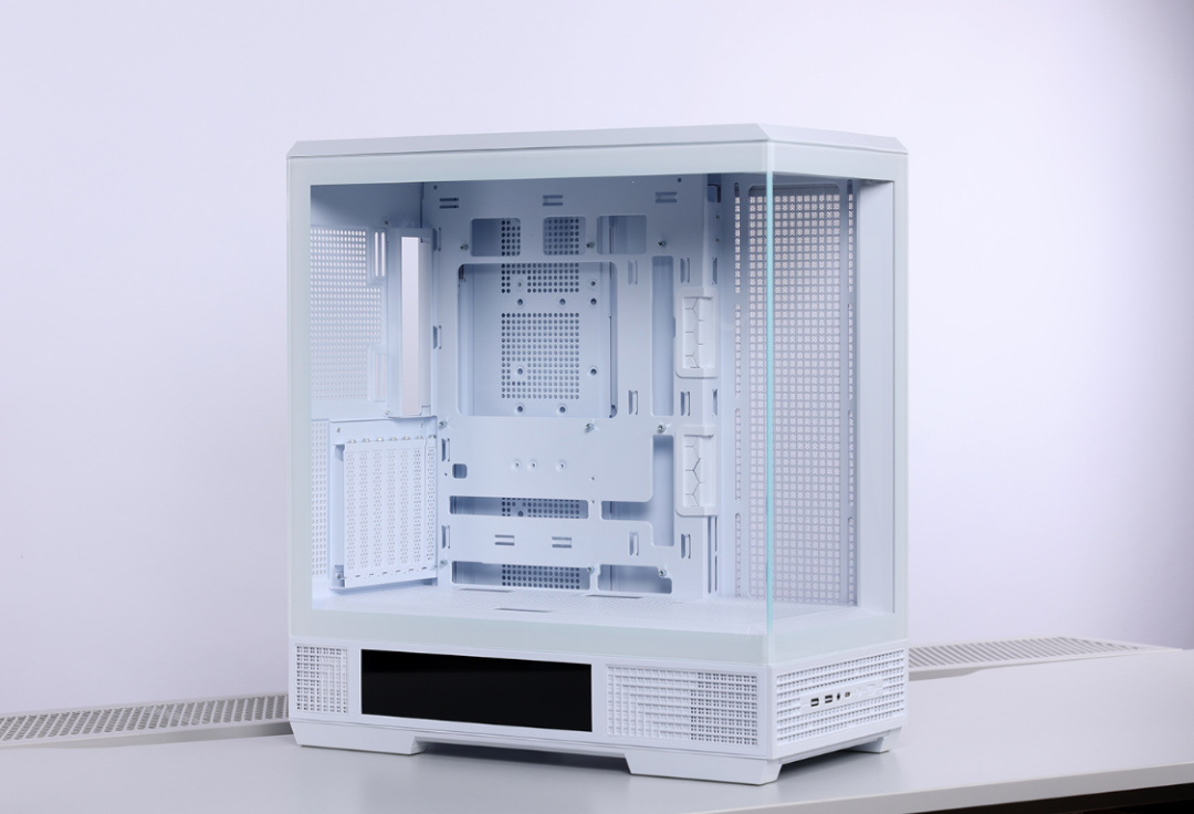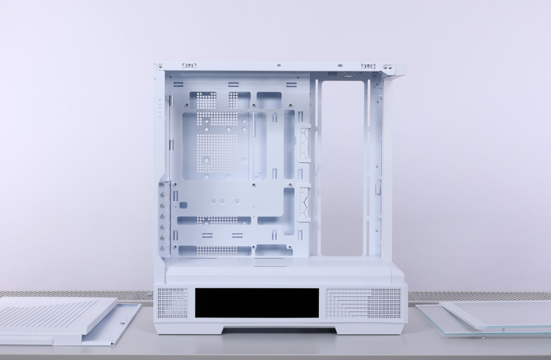 机箱采用4面快拆设计,两块侧板、顶部与前面板均采用球形卡扣 + 卡榫的结构进行固定,拆装都非常方便。兼容性方面,最大支持ATX主板安装,风冷安装限高185mm,支持顶置或侧置安装360冷排,最大支持10把120mm散热风扇。显卡安装限长高达400mm,模块化设计的PCIe槽可以直接切换到竖装模式。