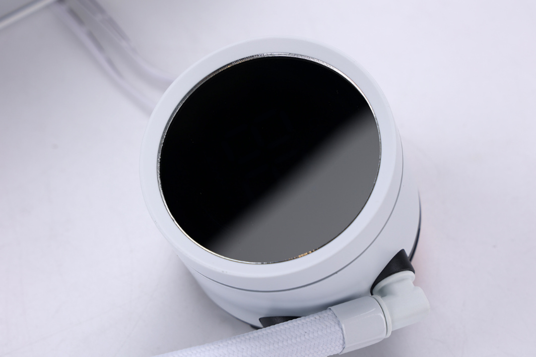 圆形水冷头顶部是一块支持旋转的镜面顶盖,顶盖下方则隐藏着一块支持显示CPU温度、占用率、频率等信息的数显屏。冷头底部则是配备了一块37*33mm的加大纯铜底座,微凸设计可以更好的贴合CPU顶盖。冷头内置一颗高性能静音水泵,最大转速可达2400RPM±10%。