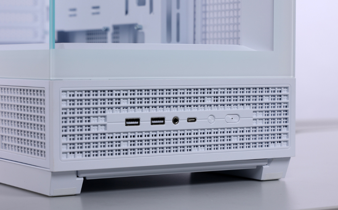 机箱I/O面板位于侧板底部,配备2个USB 3.0、1个Type-C 10Gbps数据接口、1个二合一音频口、1个开机、1个重启按钮。