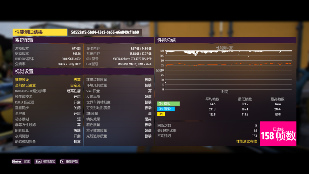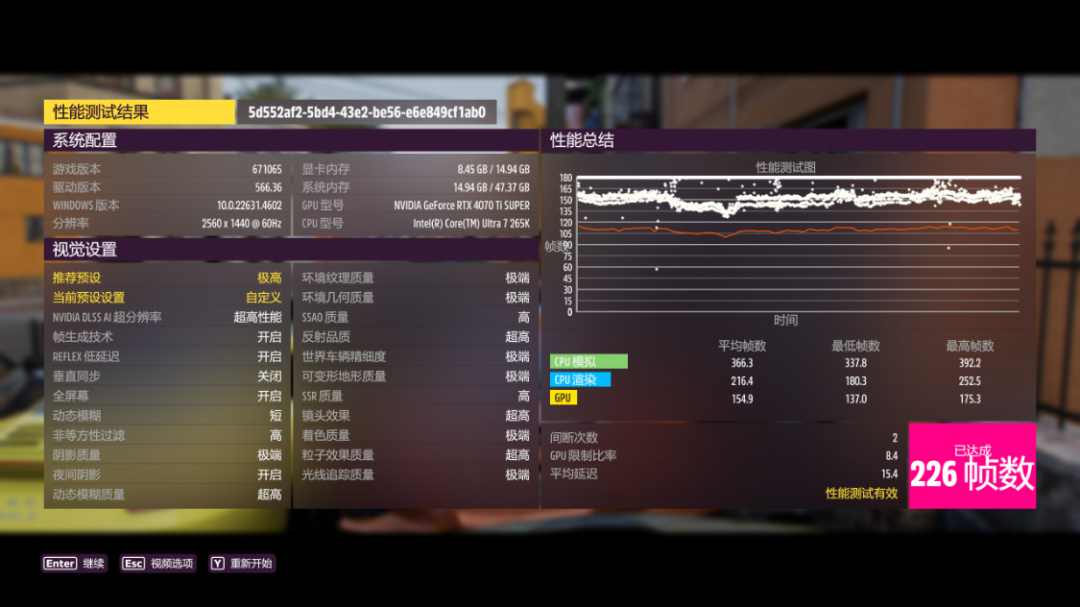 《极限竞速·地平线5》测试,极端画质,极端光追,开启DLSS 3.0并设为超级性能模式,4K分辨率下,游戏平均帧数158 FPS。2K分辨率下,游戏平均帧数226 FPS;