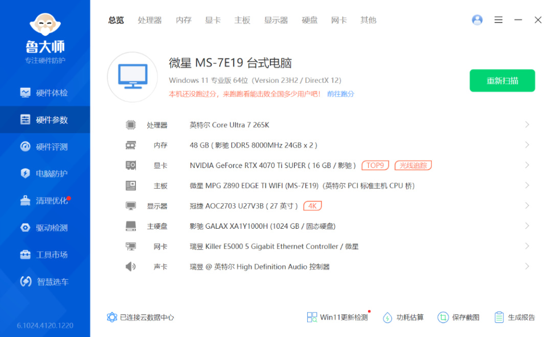 完整配置单:Intel Ultra7-265K处理器、微星MPG Z890 EDGE Ti WIFI刀锋钛主板、影驰RTX4070Ti Super星曜Plus OC显卡、HOF Extreme D5-7200MHz 24G*2内存、星曜7000Plus 1T M.2固态硬盘、爱国者星璨大岚屏显版白色海景房机箱、乔思伯TH-360白色ARGB一体式水冷、影驰HOF GS-850 ATX 3.1金牌全模组电源、影驰HOFpcie4.0显卡延长线、影驰梦境Pro 白色ARGB风扇*7(6反 + 1正)...知道你们不死心还是想问价格,浅算一下,1.4W出头,不用上多多,抖音多找几个号就可以了。当然,也仅供参考。