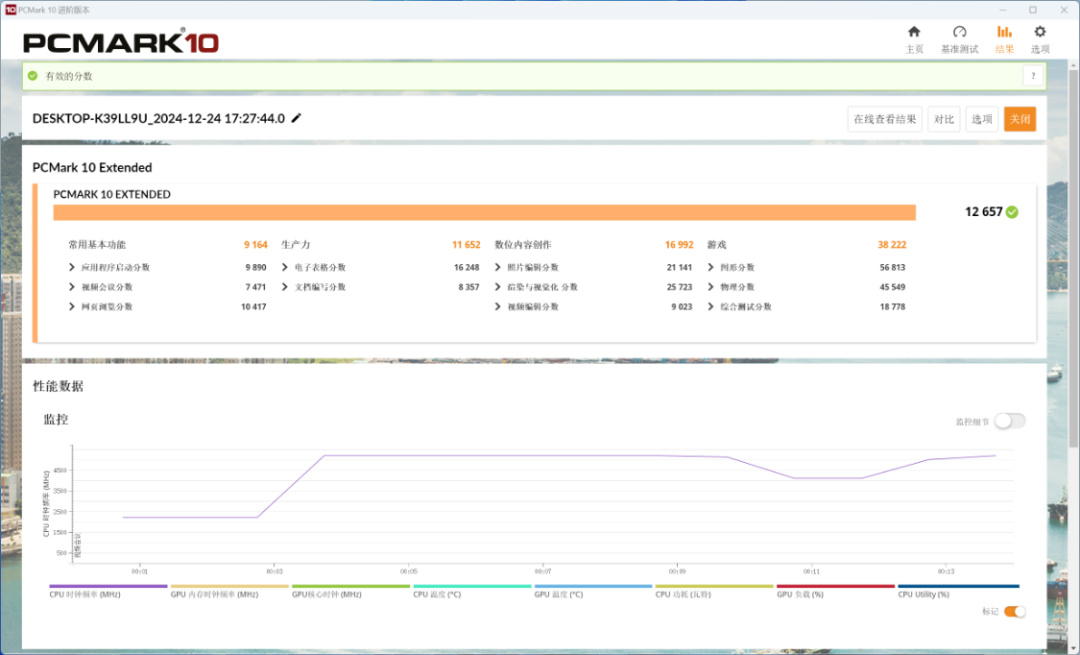 PC Mark Extended整机测试,整机得分12657分,常用基本功能得分9164分,生产力得分11652分,数为内容创作得分16992分,游戏得分38222分;