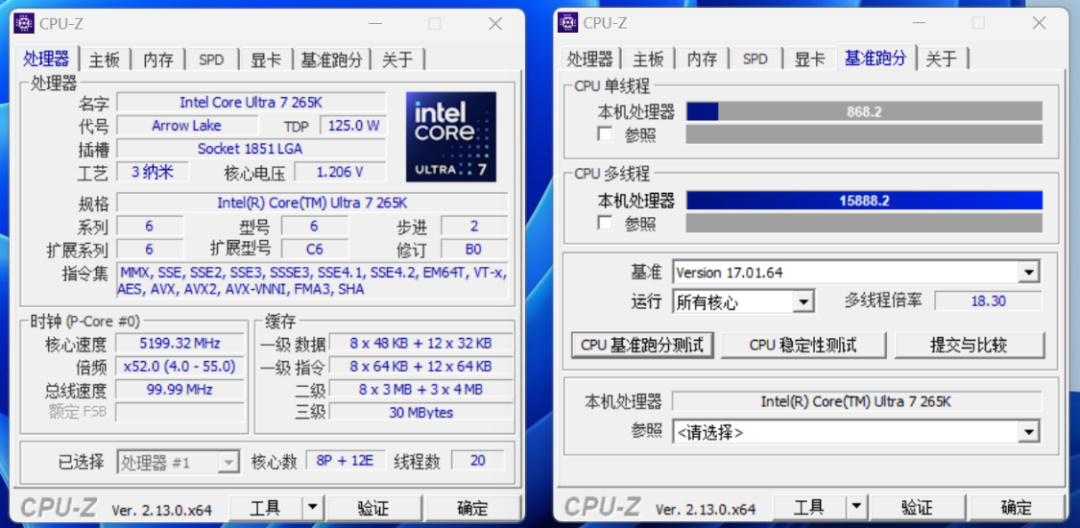 CPU-Z测试,单核得分868.2,多核得分15888.2;