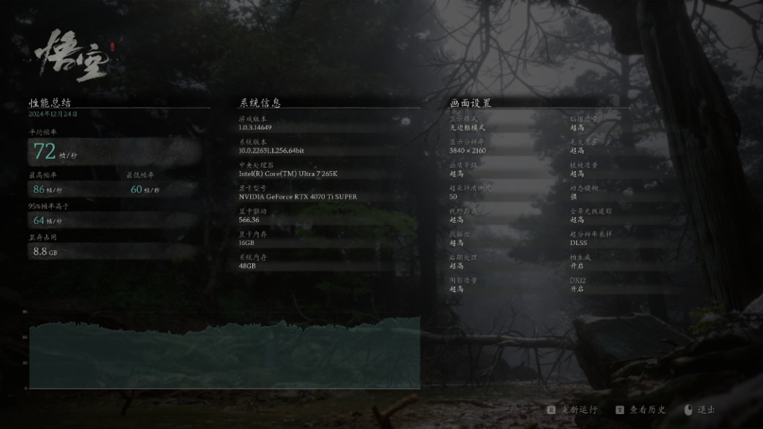 《黑神话悟空》游戏基准测试,超高画质,超高光追,开启DLSS 3.0,并将超采样清晰度设为50,4K分辨率下,游戏平均帧数为72帧/秒,2K分辨率下,游戏平均帧数为110帧/秒;