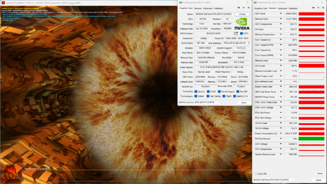 FurMark烤机测试,烤机20 Min,显卡温度为65°左右,显卡功耗为295W左右;