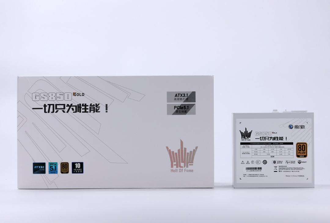 电源作为整机的动力源泉,当然也不能随便应付。今儿装机选配的是这款白色的HOF GS-850金牌全模组电源。支持最新的ATX3.1电源规范和PCIE 5.1电源标准,自带12VHPWR模组线最大可提供600W供电。电源三围,140*150*86mm,短机身的设计可以更好的兼容各种装机环境,全模组压纹线既显档次又方便走线。80plus金牌认证+全日系电解电容+10年质保+一键风扇启停的超强组合,也用得安心。