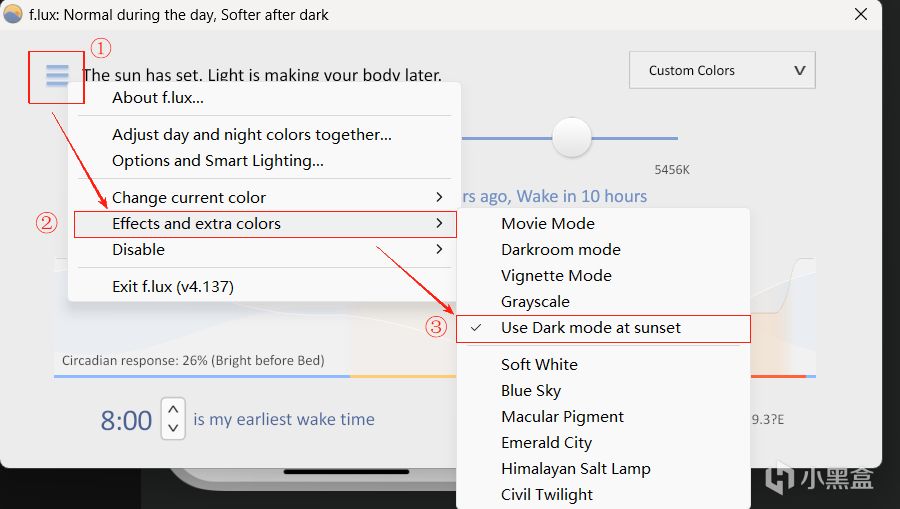 依次選擇: 設置(三條橫線)-Effects and extra colors-Use Dark mode at sunset。