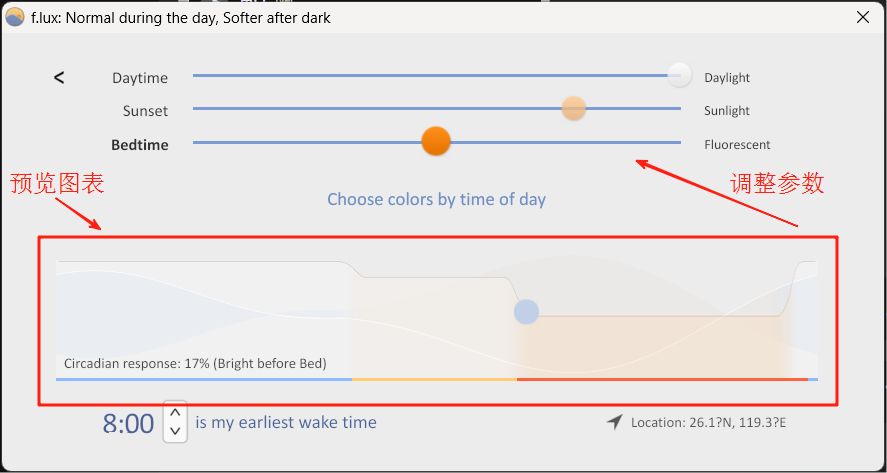 這個圖表包括三個時間段,分別是Daytime(白天),Sunset(日落),Bedtime(入睡時間)。我的三個階段的參數分別是Daylight(6500k),Sunlight(5500k),Fluorescent(4200k),這個配置不會讓屏幕看起來太暖,比較溫和,大家可以根據喜好調整。另外,雙擊圖表可以預覽整天的屏幕顏色變化。