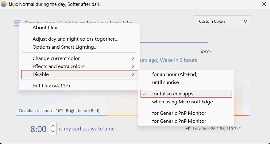 禁用1小時(快捷鍵Alt+End),禁用直到太陽昇起(可理解爲跳過今天),在全屏應用下禁用當使用MS Edge瀏覽器時禁用,剩餘的選項是在對應顯示器上禁用(在多顯示器情況下,分不清哪個可以試一試)。