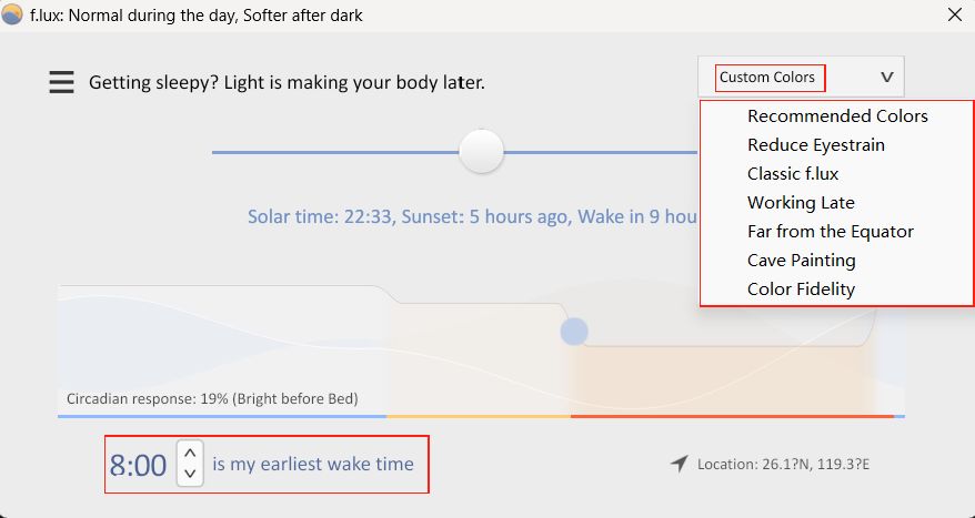 在軟件主界面左下角可以設置你習慣的最早起牀時間來校準軟件配置,在主界面右上角軟件提供了多個模式來讓你的屏幕在不知不覺中不斷變暖