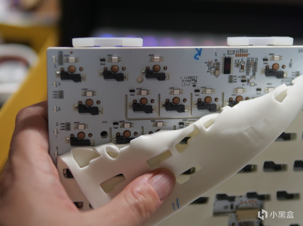 对于设计上比较容易犯错的小板和USB收纳槽部分,都设计得很靠下,即使用力按压定位板,内胆也不会和他们产生触碰,尤其轴座棉还在收纳槽部分特意挖下去一块了避免接触。