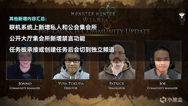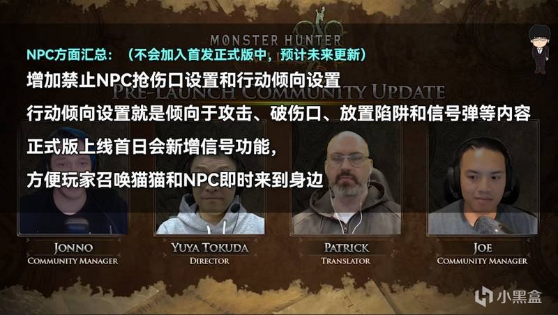 聯機系統上新增私人和公會集會所,這波對直播的博主來說福利拉滿。公開大廳集會所新增禁言功能,任務板承接或創建任務後會切到獨立頻道。NPC方面會在未來增加禁止NPC搶傷口設置和行動傾向設置。行動傾向設置就是傾向於攻擊、破傷口、放置陷阱和信號彈等內容。另外正式版上線首日會新增信號功能,方便玩家召喚貓貓和NPC即時來到身邊
