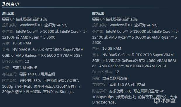 PC端目前僅說了Steam平臺上的情況,官方也是非常直白的告知與玩家所使用的硬件配置掛鉤。Steam平臺現已公佈了具體配置要求。無論最低還是推薦配置,都相比其他同品級遊戲要高上不少。結合卡普空歷來的操作,現已公佈的配置或許會在正式版發售前不久做出些許調整。而需要大家注意的是,遊戲必須在固態盤,存儲空間有140GB,遊玩全程需要聯網